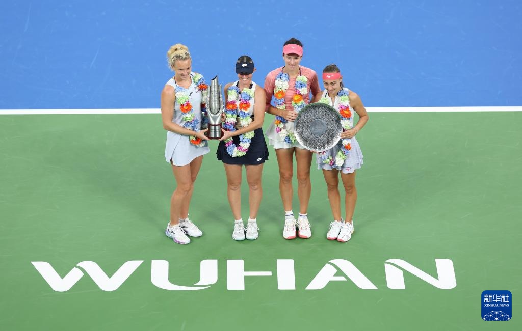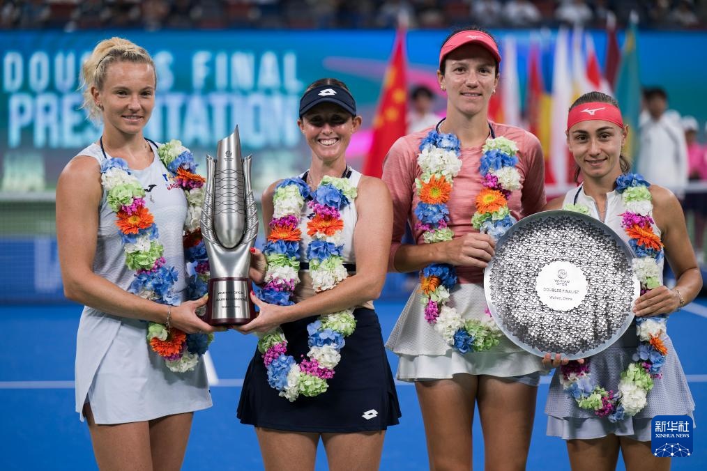 10月12日,武网娃获冠军亨特(左二)/斯尼亚科娃(左一)、亨特亚军达尼丽娜(右二)/克鲁尼奇在颁奖仪式上。斯尼