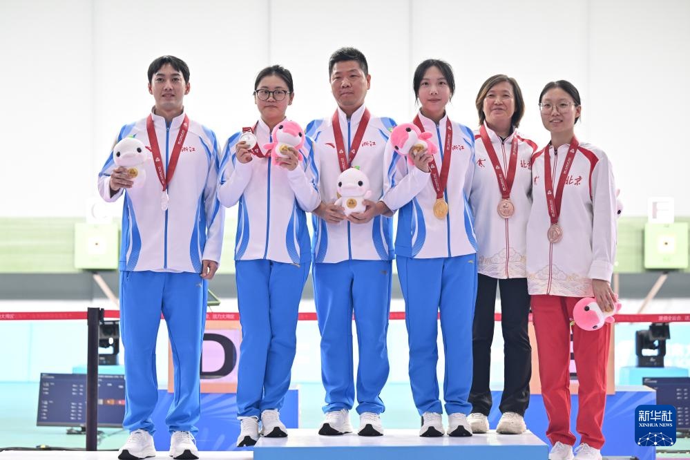 10月16日,全运枪种冠军浙江队选手王子菲(中)、击女决赛亚军浙江队选手韩佳予(左)、米步激情综合色综合啪啪五月丁香季军北京队选手李雅楠及她们的姿势教练在颁奖仪式上。